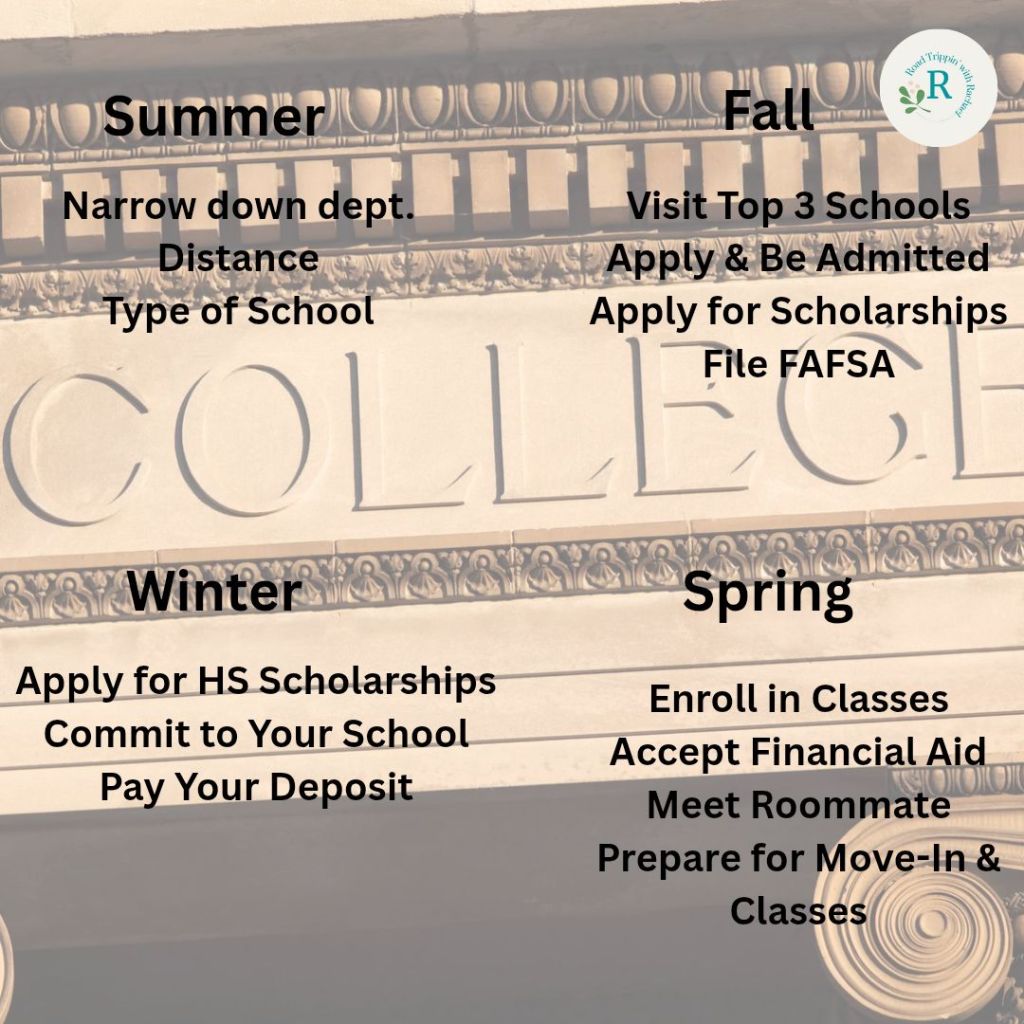 Fall – If you can get it narrow down over the summer to three – five schools, you should go visit them, and apply to the top three. Get all your documents in to be admitted, sign up for the ACT if needed for the fall and get the paperwork done. Remember that FAFSA normally opens in October each year. The sooner you get that filled out the faster you will get your financial aid packages from the colleges you are considering.